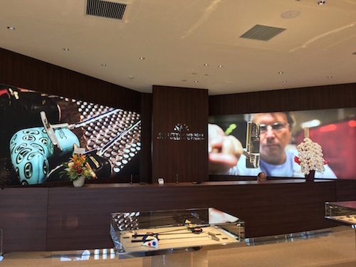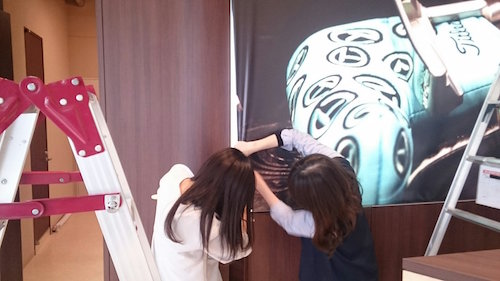 こんにちは、pansいぬかいです。5月の連休明けにゴルフパターでは有名なブランドショールームが表参道にOPENしました。今回はそちらの新設ショールームで採用して頂いた大型マルチフレーム<ファブリックテンションシステム>をご紹介します。 w4000 x h1700mmが左右に2つ、エレベーターを降りるとメインビジュアルとして目の前にど〜んと現れます。