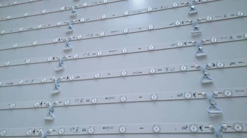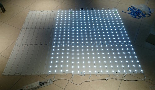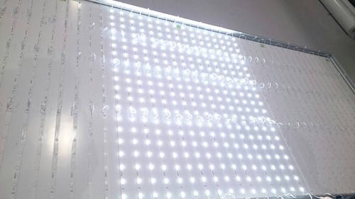 今回は一番明るい新スーパースリムLEDをマルチフレーム65mmと組み合わせて壁面固定しました。最初に大判のアルポリへLEDをペタペタと貼り、1回路ずつ点灯テストしておきます。