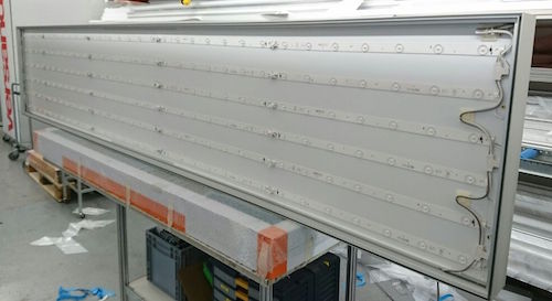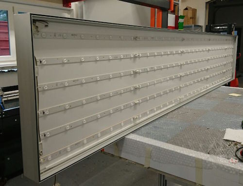 さて、お題は「D35/65mmの高輝度タイプを使っているが、同じ輝度で両面発光させたい」というものです。両面発光できるアルミはサイドライト用のものなので、D80mmを選択。そしてアルミ複合版にLEDモジュールを貼って完成します。