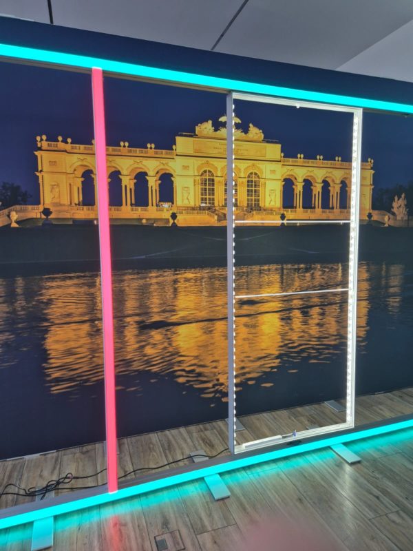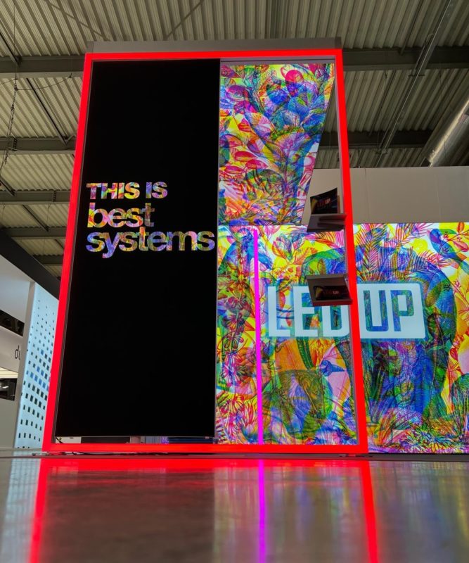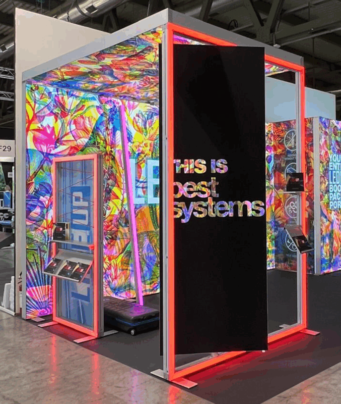 こんにちは、pansいぬかいです。7月から新発売になったLINEUPの使い方事例です。ドイツの展示会ブースで3フレームを天井から吊った写真です。残念ながら今日現在この1枚しか手に入らないのですが、奥の方にも壁に使っている様子です。