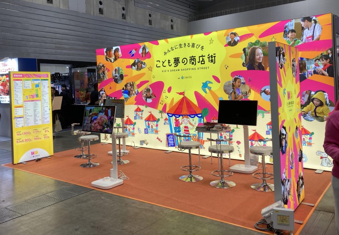 次に「こども夢の商店街様」。文部科学省後援のキャリア教育イベントを行っている一般社団法人さんで、イオンモールなどのショッピングセンターを中心に全国各地でイベントを開催されています。今回のご利用は初めて横浜パシフィコのSCビジネスフェア2026での出展ブースにご利用頂きました。OPENブースにモニターを配置し、自然と目立つ黄色をセンターに置いた明るいグラフィックでとても素敵です。