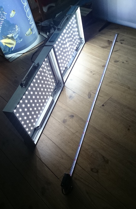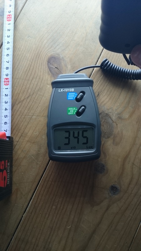今回は双方の面から30cm離れた場所で照度計を床から15cm程の所で測定しました。ちなみに、ルーメンと混同しがちですが、ルーメンは「全方向に出ていく光の強さの総量」だそうで、照明器具などの単位はこちらですね。