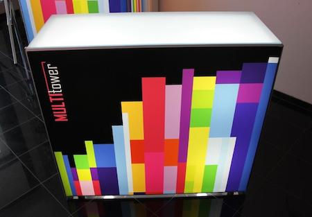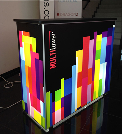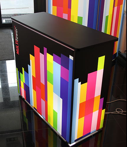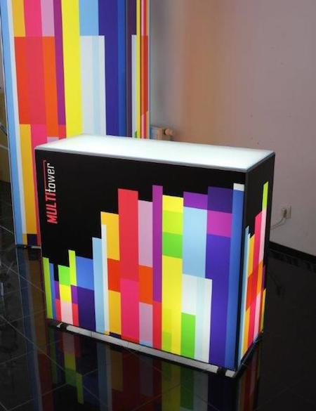 既存のポータブルカウンターは「受付用」として使う用途前提が多く、そのため裏側は空いていて中棚が付いています。 一方こちらのマルチフレームを使ったディスプレイカウンターは360度グラフィックプリント展開できますので、会場にポンッポンッポンッ、とおいて行けば1つ1つの独立したテーブルとして使えますね。