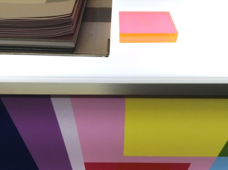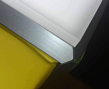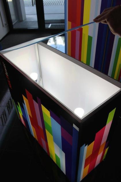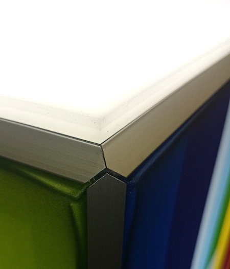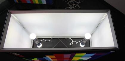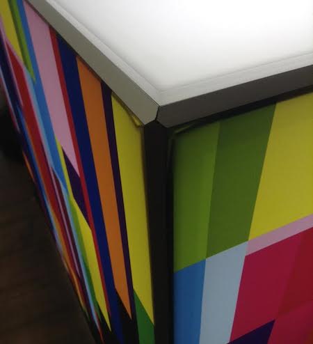 上記の写真は上の部分もホワイトバックリットファブリックで、行灯のように光らせていますが、ココをMDFやアクリルなどの天板にすれば、光るディスプレイカウンターの出来がりです。